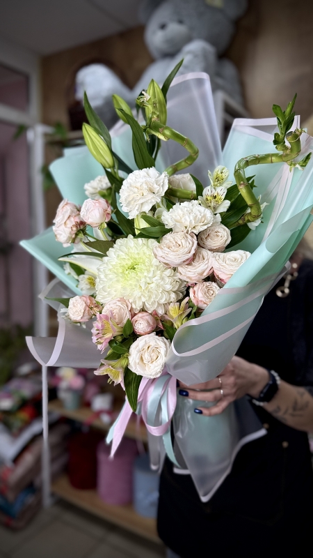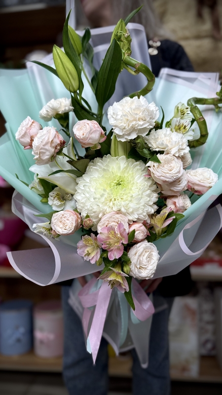 Лилия, Бамбук, Хризантема Одноголовая, Гвоздика цветная, Альстромерия, Роза кустовая 50см, Плёнка, Лента, Открытка