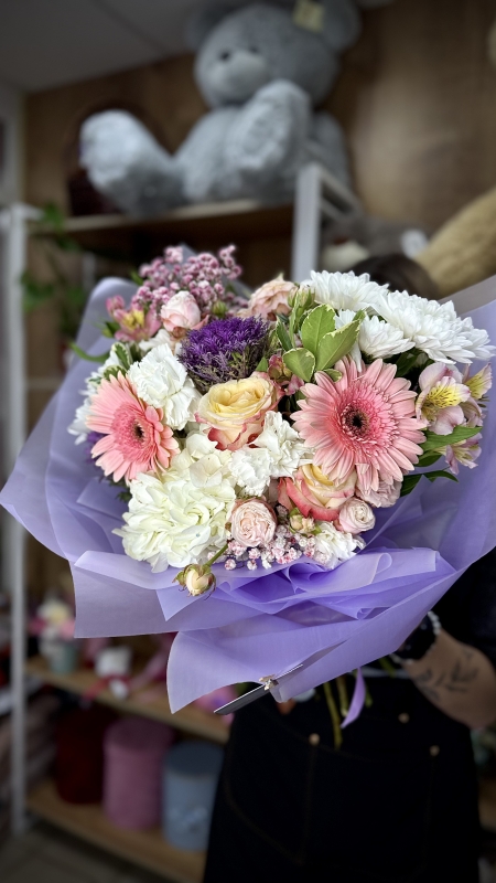 Букет "Сиреневый Закат" — это волшебное сочетание цвета и света, которое переносит нас в мир романтики и мечтаний. Каждая деталь этого букета пронизана атмосферой уюта и тепла, как последние лучи солнца, мягко окрашивающие небо в нежные сиреневые и розовые оттенки.