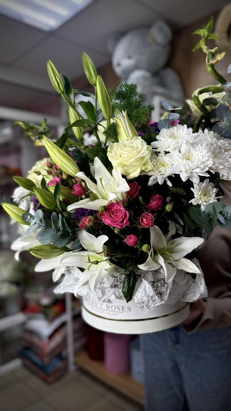 Коробка, Биофлора, Тишью, Бамбук, Лилия, Хризантема кустовая, Роза кустовая 70см, Роза эквадор 70см, Эвкалипт, Брассика, Монстера, Аспарагус